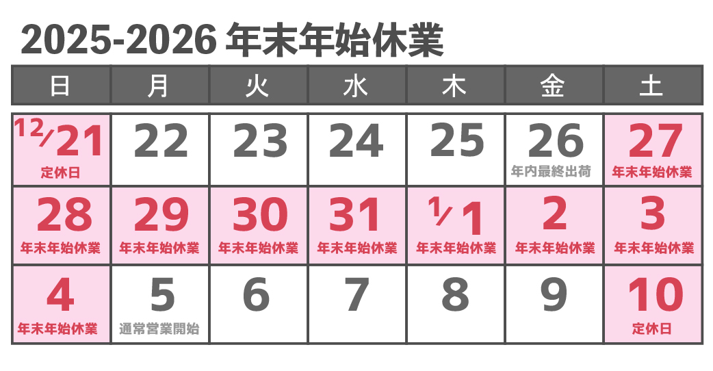 年末年始の休業期間中にお問い合わせいただきました件に関しては、休業明けの1月4日(木)より